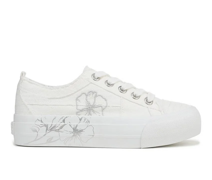 This platform sneaker adds playful detail to a bold everyday silhouette. A canvas upper features decorative floral embellishments that extend onto the outsole. Lace-up styling with metallic eyelets provides a secure fit. The round toe includes a textured cap for durability. Finished with a platform sole for standout height.