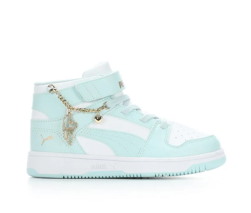 Elevate your sneaker game with this bold mid-top design that blends sporty attitude with signature Puma flair. Featuring a smooth synthetic upper and supportive mid-rise silhouette, this shoe includes a classic lace-up front with an added hook-and-loop strap for lockdown feel. The standout metallic Puma charm adds a stylish twist, while perforated detailing at the toe enhances breathability. Built on a durable rubber outsole, this look is made for confident strides all day long.