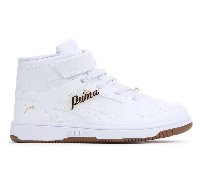 Elevate your sneaker game with this bold mid-top design that blends sporty attitude with signature Puma flair. Featuring a smooth synthetic upper and supportive mid-rise silhouette, this shoe includes a classic lace-up front with an added hook-and-loop strap for lockdown feel. The standout metallic Puma charm adds a stylish twist, while perforated detailing at the toe enhances breathability. Built on a durable rubber outsole, this look is made for confident strides all day long.
