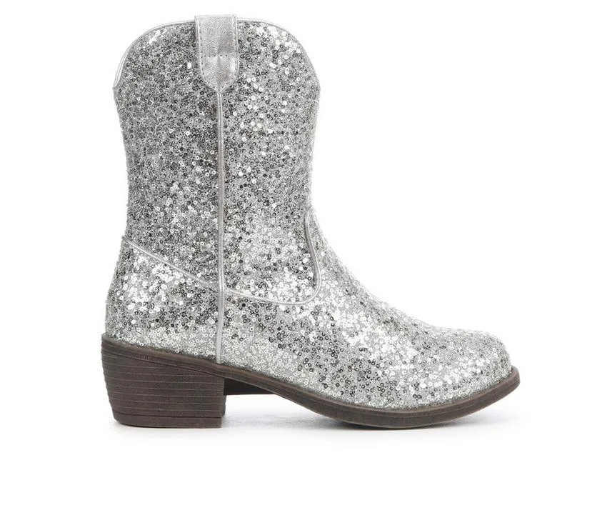 This kids’ western boot adds a sparkle to every step with its all-over glitter finish and classic cowboy silhouette. Designed for both dress-up and day-to-day flair, it features a smooth synthetic upper, side pull loops for easy on and off, and a low stacked heel for just the right touch of lift. Whether worn to a party or paired with jeans, it’s a fun twist on a classic style.