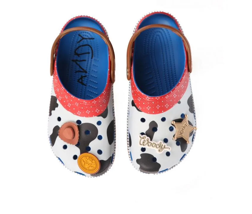 Shake out the snake in your boot, Sheriff Woody makes his debut as a Classic Clog! This exclusive design features a wrapped print reminiscent of Woody’s iconic plaid shirt and cow print vest, topped with four exclusive Jibbitz™ charms. These clogs also feature the beloved “Andy” signature on the inside sole.
