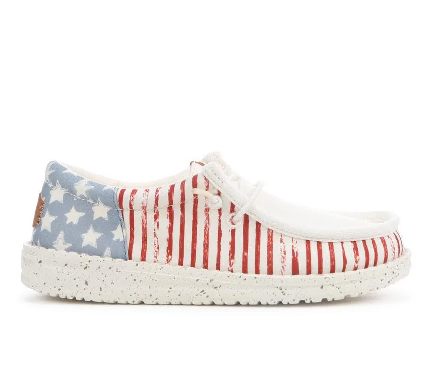 Let them show off their star-spangled spirit with the HEYDUDE Wally Funk Americana Stars. This kid-friendly slip-on features a lightweight canvas upper covered in red, white, and blue flair. Built for easy wear with a flexible sole and cushioned insole, this shoe is perfect for play, travel, and everything in between. A visible HEYDUDE logo on the back completes the patriotic look with signature style.