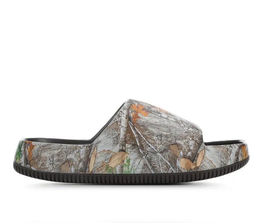 Nike collaborates with Realtree to present a camo version of the Calm slide sandals. The water-friendly foam shoes feature the classic Realtree Edge® woodland camo pattern throughout, with a “Baroque” brown footbed and outsole. The outsole features textured grip to help prevent slipping even on wet surfaces.