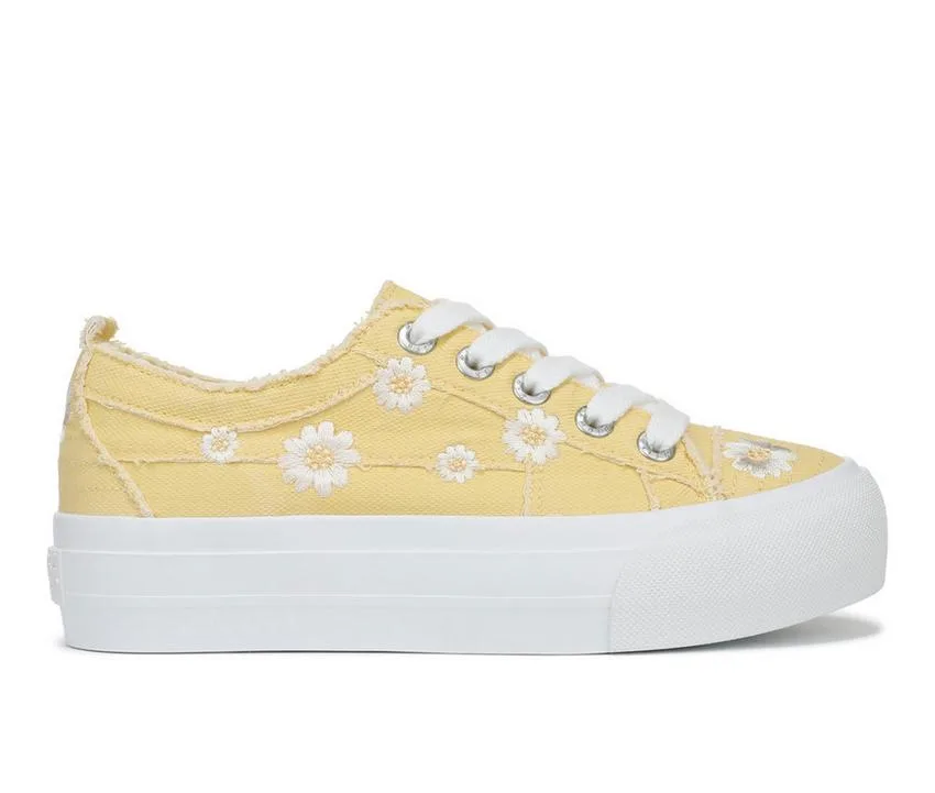 This platform sneaker brings playful detail to a classic silhouette. The upper features canvas, fabric, or microsuede-inspired materials with embroidered floral accents and quilted texture. A lace-up closure with metal eyelets provides a secure fit. The round toe keeps the design wearable for everyday styling. Finished with a bold platform sole.