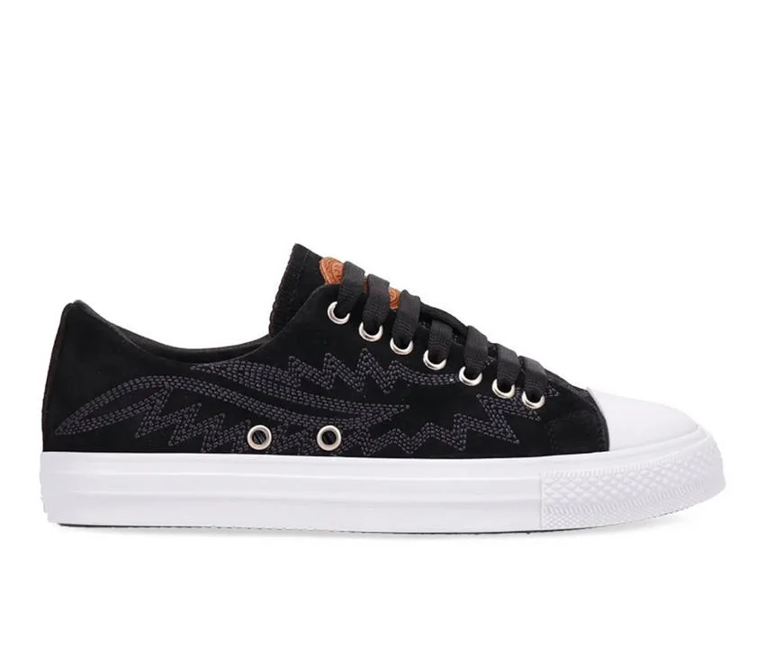 Bring edgy style to your everyday look with these low-top sneakers that blend bold texture with classic construction. Featuring a rugged canvas-like upper with zigzag embroidery and dual metal eyelets for breathability, these sneakers offer the perfect mix of street-smart detail and functional comfort. The lace-up front provides a secure fit, while the cushioned interior and vulcanized rubber sole ensure reliable comfort and traction throughout your day. Finished with a clean, timeless silhouette that works with everything from jeans to joggers.