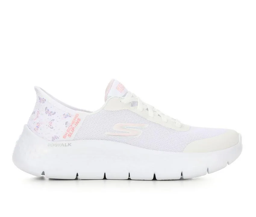 Step-in to convenient walking comfort and cushioning wearing Skechers Hands Free Slip-ins® GO WALK® Flex. Designed with Heel Pillow™, this sporty style features an athletic mesh upper with stretch laces, floral print trim, Skechers Air-Cooled Memory Foam® insole, lightweight ULTRA GO® cushioning, and Flex Pillars™ for added support.